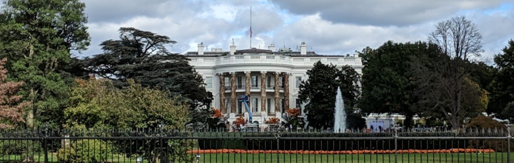 En point de départ, nous décidons d’aller prendre le café à la Maison Blanche. Seulement voilà, le président semble avoir un planning surchargé aujourd’hui (c’est Halloween Party ce soir) et nous restons coincés à la grille, au même titre que les autres touristes déçus et que les quelques manifestants qui protestent contre le gouvernement, sur des thèmes comme l’immigration ou le port des armes. A l’arrière de la Maison Blanche, le personnel s’affaire pour finaliser la mise en place des décors d’Halloween. Sur le site officiel de la Maison Blanche, il est indiqué que la soirée commence à 17h00 (vous pensez que Trump va se déguiser? Il est déjà assez orange comme ça, non? A cet instant, en écrivant ces mots, je prie fort pour que notre blog soit épargné par la censure!). Au-dessus de nous, l’hélicoptère présidentiel fait plusieurs allers-retours (un problème de costume, peut-être?). Au loin, du côté du parc, nous entendons la musique qui encourage les coureurs du Marathon annuel du Corps des Marine de Washington.