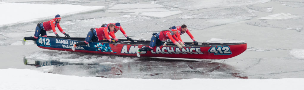 Le principe? Des équipes s’affrontent dans une course de canot dans les eaux encore en partie glacées du Saint-Laurent. Le challenge consiste donc à réaliser le parcours imposé le plus rapidement possible, en alternant la course classique à la rame et la course « à pied », lorsque l’eau est gelée et qu’il faut sortir du canot pour le pousser sur la glace! Oui, oui, ils sont fous ces Canadiens!