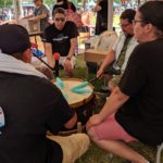Au cours de la journée, nous faisons une pause pour déjeuner et échapper au soleil qui cogne sur les tribunes du public. Différents kiosques proposent majoritairement de la cuisine amérindienne : des épis de maïs, des galettes de maïs (tacos), de la viande de bison, des salades de haricots rouges, du pain frit etc. Nous nous laissons tenter par un burger de bison, une salade de riz sauvage et quelques tranches de pastèque bien rafraîchissantes. D’autres kiosques un peu moins traditionnels proposent inévitablement de la poutine, des frites ou encore de la citronnade directement servie dans des seaux de plage!