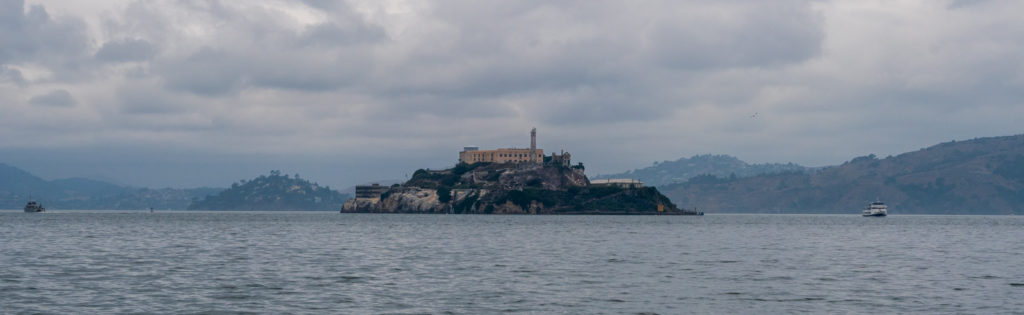 Les odeurs de cuisine des alentours nous ouvrent l’appétit et nous prenons une table au Bubba Gump, une chaîne de restaurants ouverte par une famille de pêcheurs dans les années 90, en hommage à Forrest Gump. On retrouve de nombreuses références au film dans toute la décoration. La spécialité ici, ce sont bien sûr les crevettes, servies avec des sauces délicieuses s’en lécher les doigts (mais on peut aussi utiliser le rouleau d’essuie-tout placé sur la table). Malgré la grisaille, nous avons une belle vue sur l’océan, la marina et même sur l’île d’Alcatraz et sa fameuse prison. Nous apercevons même quelques dauphins (surtout leur nageoire dorsale)!