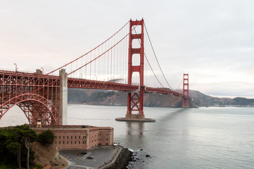 Pour finir la journée en beauté, nous retrouvons le pont du Golden Gates, que nous avions traversé la veille en voiture. Ce soir, il parvient à transpercer les nuages qui l’entourent. Finalement, je trouve que c’est plus impressionnant de le voir comme ça que de rouler dessus. Sa couleur rouge et ses deux immenses piliers le rendent reconnaissable parmi tous les ponts! Pour l’anecdote, il est officiellement « orange » et non « rouge », d’après le classement international des couleurs.