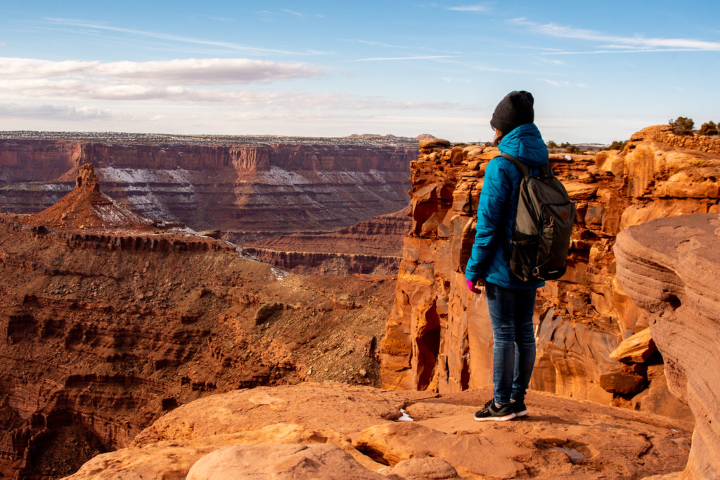 Frigorifiés, nous terminons notre tour rapide de Canyonlands par le Grand View Point Overlook, le plus beau point de vue des lieux. Encore une fois, nous sommes stupéfaits par le relief que nous découvrons.